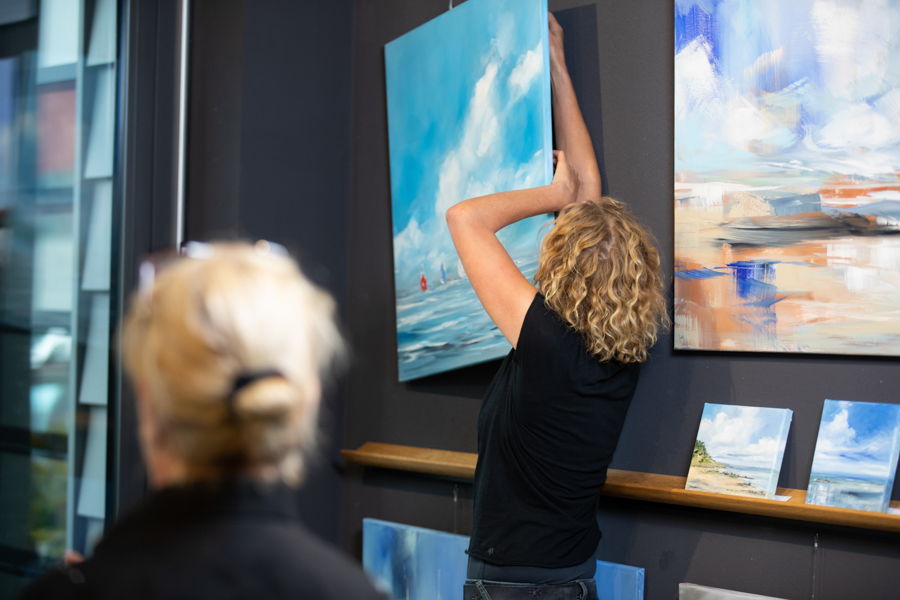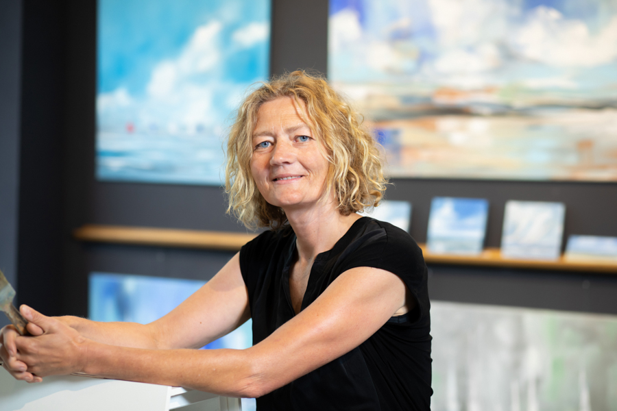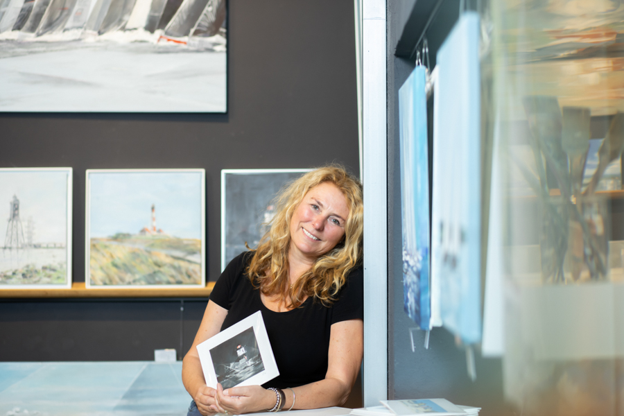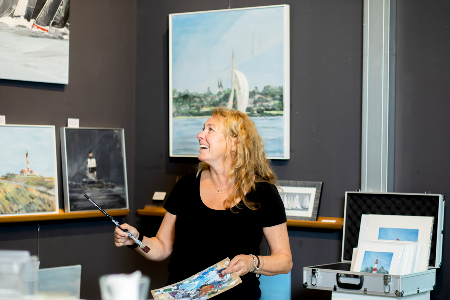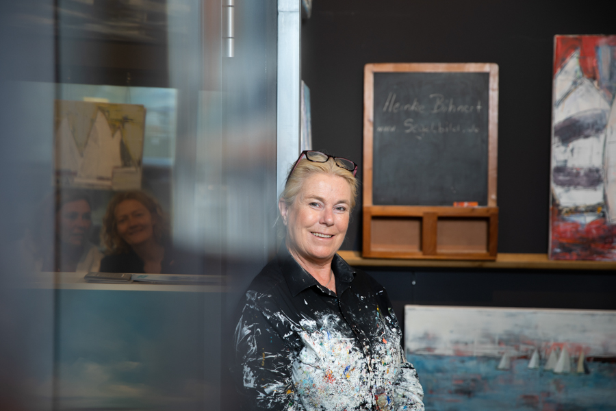 Die 3 Malerinnen: Ines Ramm, Susanne Westphal und Heinke Böhnert wollten neue Portraits für Presseberichte, Internetseite und Veröffentlichungen. Ihre Gallary ist im Yachting Heritage Centre der Robbe & Berking Werft direkt am Flensburger Industriehafen. Das besondere an vielen Ausstellungsräumen ist, dass Spots und Lichtquellen aus unterschiedlichsten Richtungen mit verschiedenen Lichtfarben das Fotografieren erschweren. Ich setze gern mein eigenes Licht und beziehe dabei das Umgebungslicht ein. Insgesamt soll ein harmonisches Bild mit natürlichen Farben entstehen. Zusätzlich wichtig war in diesem Fall, dass die Farben der Bilder im Hintergrund auf dem Foto auch mit dem Original übereinstimmen.